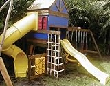 The Playkids 3-Position Swing with Wood Floor has a tower of 5 x 5 feet size with 60 inch high platform. The 3-Position Swing with Wood Floor comes with 5 x 5 feet hard plastic or wood roof, 5 x 5 feet wood floor, three position swing set with 4 x 6 inch beam, climbling ladder, rope ladder, wave slide, hard plastic upper clubhouse, horse glider with coated chain. Hardware includes stainless screws, galvanized lag bolts with plastic caps.